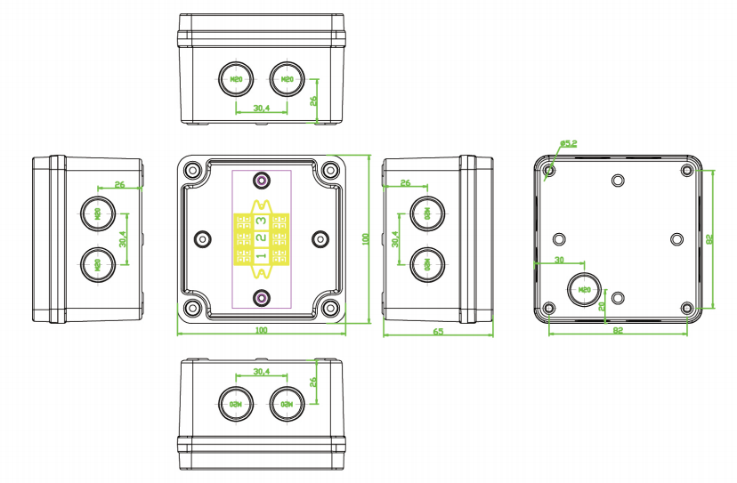 4颗M5螺丝安装,自带9*M20敲落孔,具体如下图: