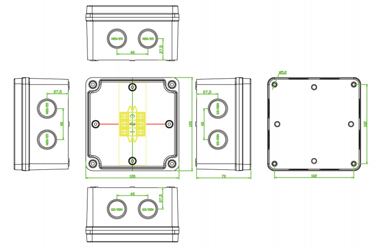 4颗M5螺丝安装,自带8*M20/M25敲落孔,每个敲落孔由2圈组成,可供用户自由选择,具体如下图:
