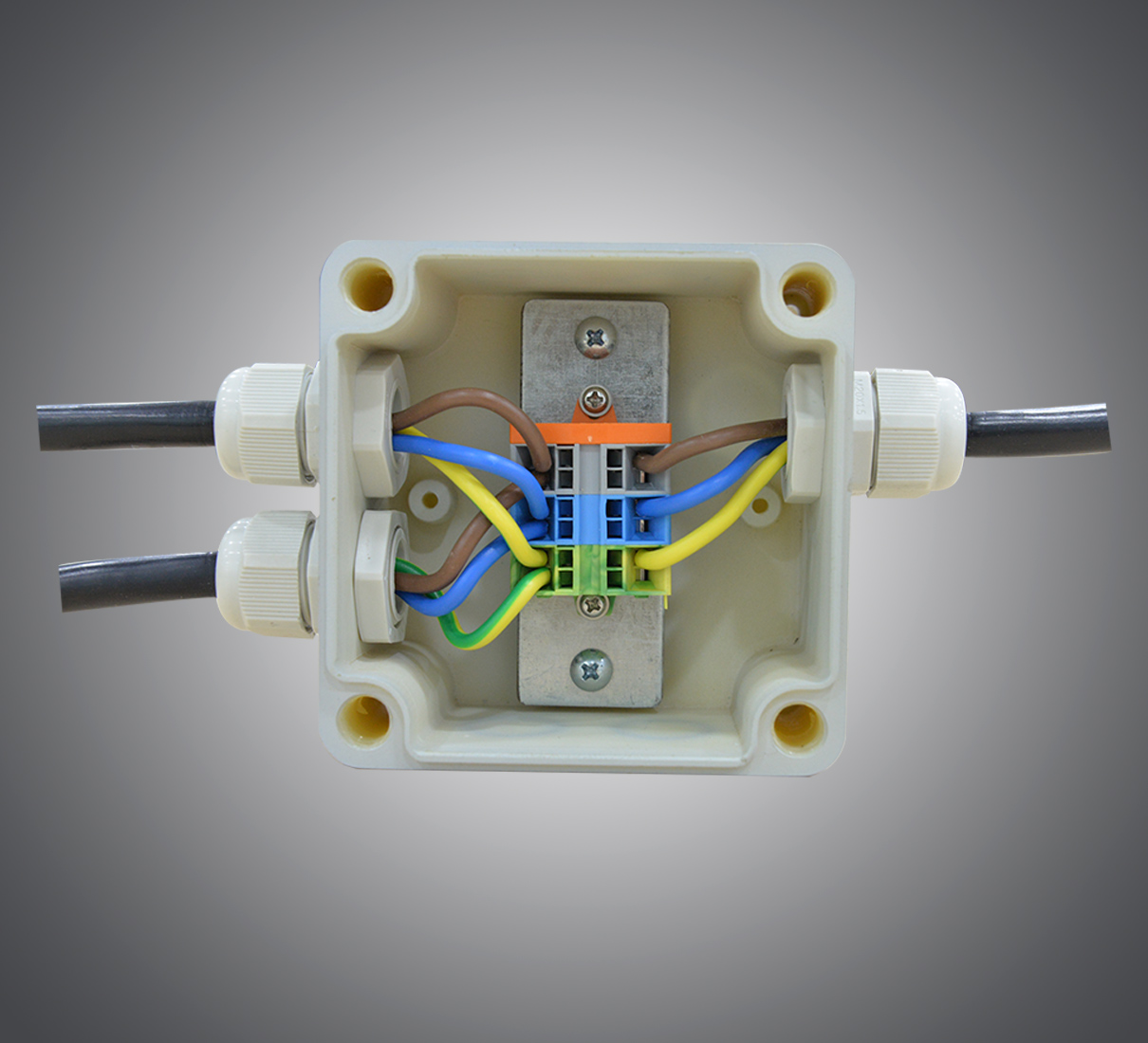 ◇ 产品内置3极或5极WAGO 264系列端子,可一进一出和二进二出,线径0.5-2.5mm²。电流20A,耐压690VAC。